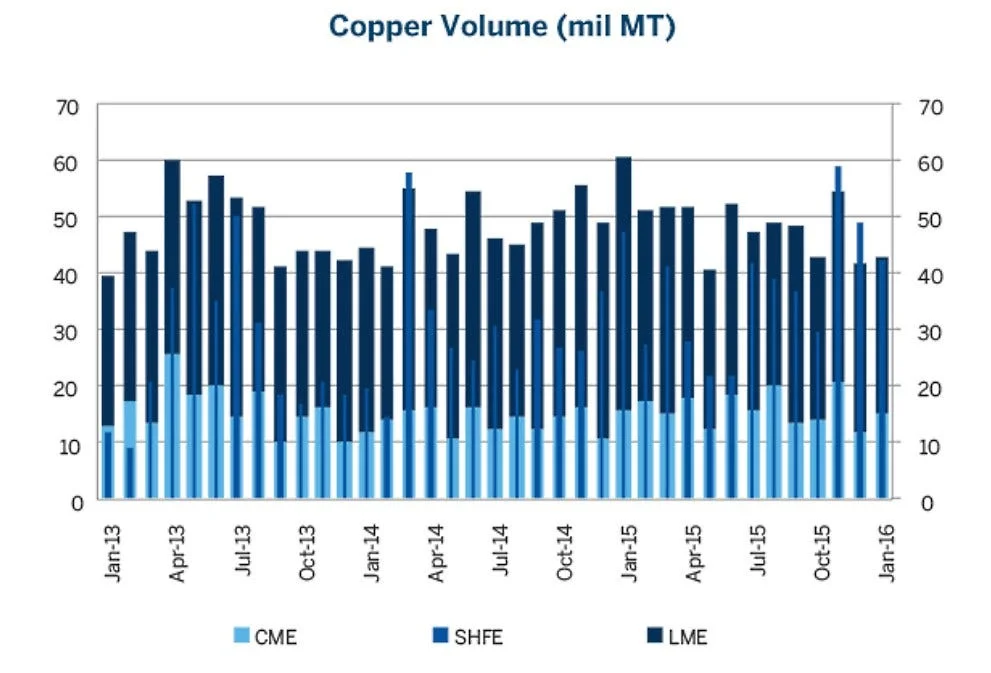 The chart below shows the variability in monthly copper inventory volumes by exchange: